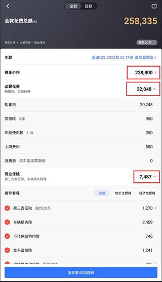 4、选择完成后,我们就能看到该车全款的裸车价格、必要花费以及商业保险3项了,点击数字右侧的小箭头还会显示具体费用细节。