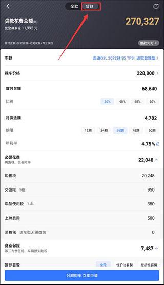 5、最后我们再点击上方的贷款按钮进行切换,在这里我们就能看到分期计算的一些具体金额了。用户还可以对首付比例、月供期限、年利率进行调整,软件会及时计算出相应的首付金额和月供金额。