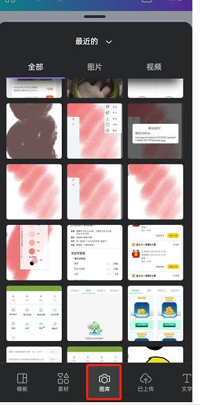 3、进入到画布后,在画布的下方菜单栏中,点击【图库】,界面就会出现你相册中的图片,所以我们只要直接点击提前保存好的图片就可以导入,然后调整大小和位置即可,如图所示: