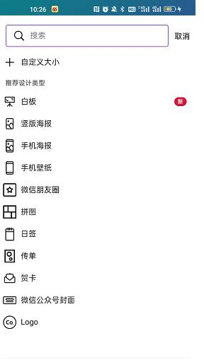 2、根据你需要制作的内容选择,选择合适的画布尺寸,如果这里没有你要的尺寸,可以选择【自定义大小】,自己设置画布的大小,如图所示: