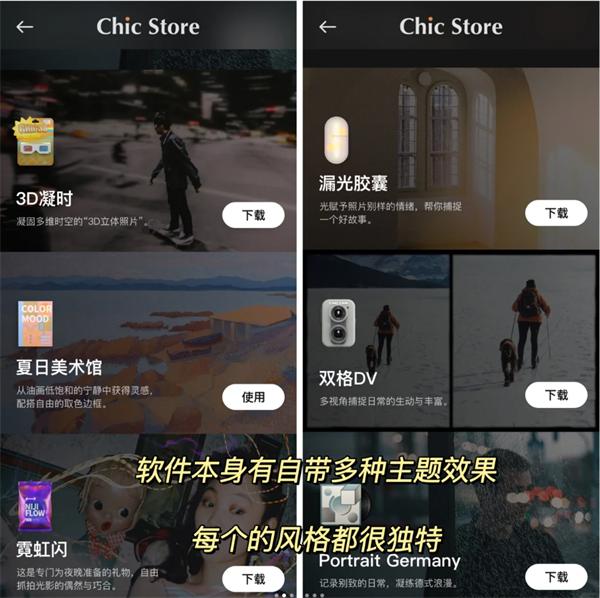 Chic相机是一款功能强大的拍摄应用,它以其出色的滤镜效果和独特的拍摄体验赢得了用户的喜爱。ChicCam相机的界面设计简洁而优雅,操作起来非常方便。它的相机功能非常强大,无论是在光线充足还是光线不足的情况下,都能拍出高质量的照片。而且,ChicCam还提供了丰富的拍摄效果,包括复古、黑白、暖色等,让你的照片更具个性和艺术感。此外,ChicCam还具有强大的美容功能。它可以自动识别你的脸部特征,进行智能美颜,让你的皮肤看起来更加光滑细腻。同时,它还提供了各种特效贴纸,如滤镜、文字、贴图等,让你的照片更具创意和趣味性。