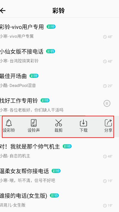 3、点击一首自己喜欢的彩铃,可以对它进行设置铃声、裁剪、下载、分享等操作。
