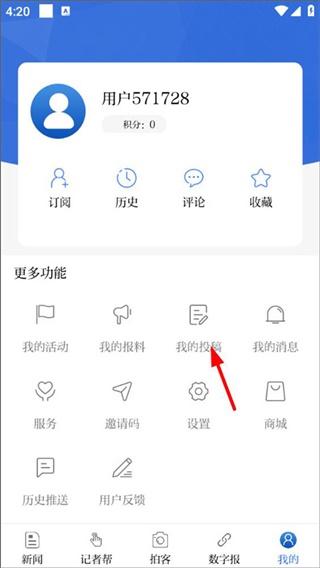 2、我的页面中用户可查看订阅、历史、评论、收藏等,找到更多功能,点击我的投稿;