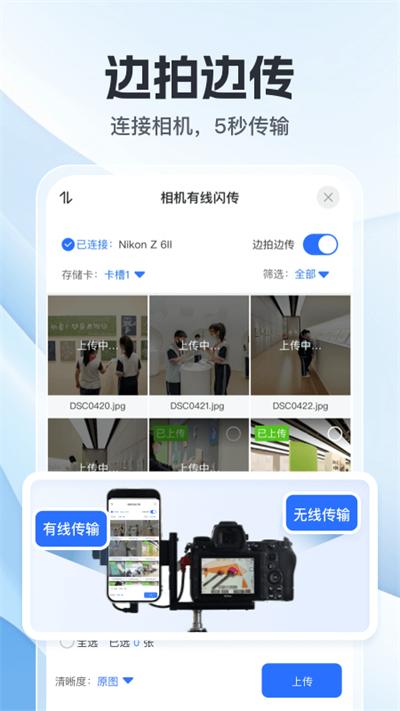 在闪传页面上可以设置照片类型和上传模式,照片类型默认选择“标清”,上传模式默认选择“边拍边传"