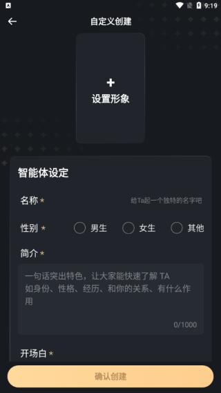 3、根据自己的想法设定智能体的形象、名称、性别、简介、性格等。