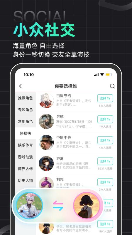 自由切换“外在”,一个人可以是多个不同的名人,同一个名人可以由多个人共同演绎。上皮说话,让对话分分钟变得有趣,不断出现各种话题。