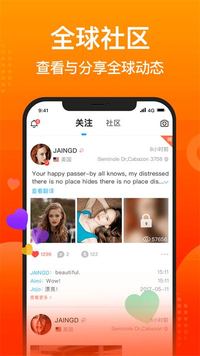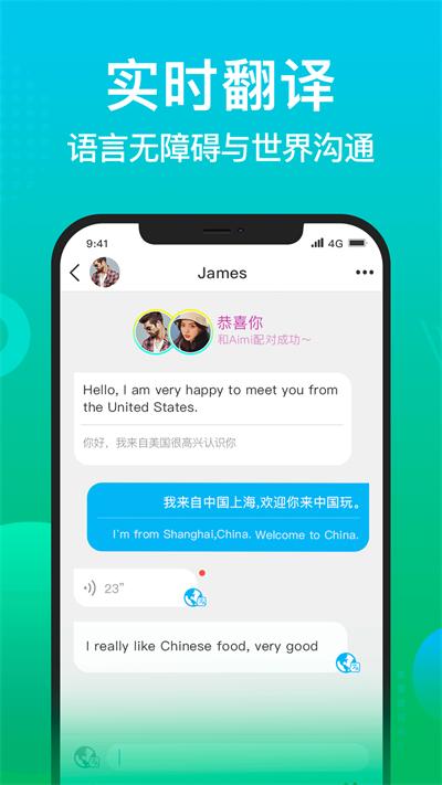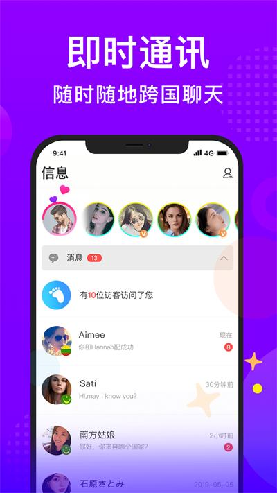 WorldTalk是一款全球性交友软件,使用用户高达5亿人,包含中国、欧美、日韩、俄罗斯、乌克兰等180余个国家地区,内置100多种语言的实时翻译功能,让全球用户可以无障碍进行沟通交友。WorldTalk提供了用户的个性资料卡展示,用户在浏览其他用户账号时可以看到对方的国家/地区所在,以及职业,爱好,聊友足迹等多种信息,通过这些信息也可以帮助用户精准到找到三观相符、兴趣相投的好友进行交谈。