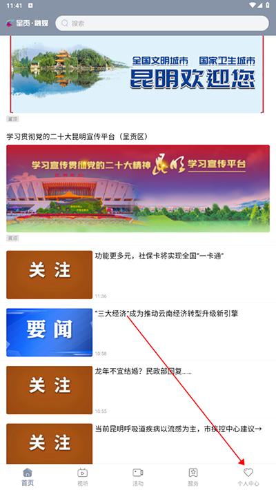 1、打开手机呈贡融媒app首页,点击下方个人中心;