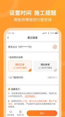 3、师傅设置好施工时间后,施工前可收到施工通知,更好规划行程安排。