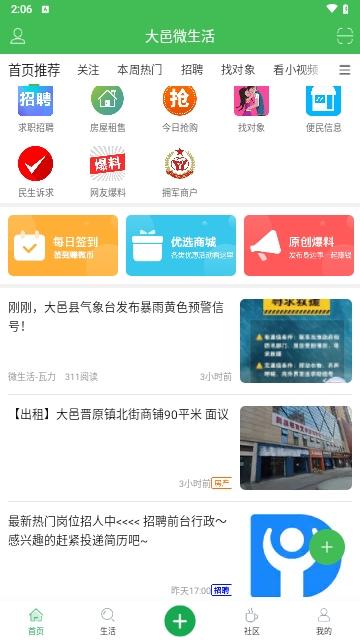 大邑微生活是一个本地生活和社交平台,为大邑地区的用户提供了丰富的资讯内容,也汇集了当地的各类生活资讯,涵盖了求职招聘、房屋租售、同城好店等各方面,相应的也帮助用户在线看新闻、找房子、找工作、相亲交友等。
