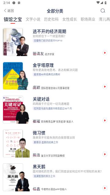靠谱讲书是一款书籍讲解软件,致力帮助用户更轻松的了解书籍内容。软件覆盖亲子家庭、中外历史、文学艺术、心理健康、商业财经等知识内容,总有一个分类是你感兴趣的。只需30分钟,大咖就能把一本书降头,让你直接汲取书籍里营养。快来下载收听呢。