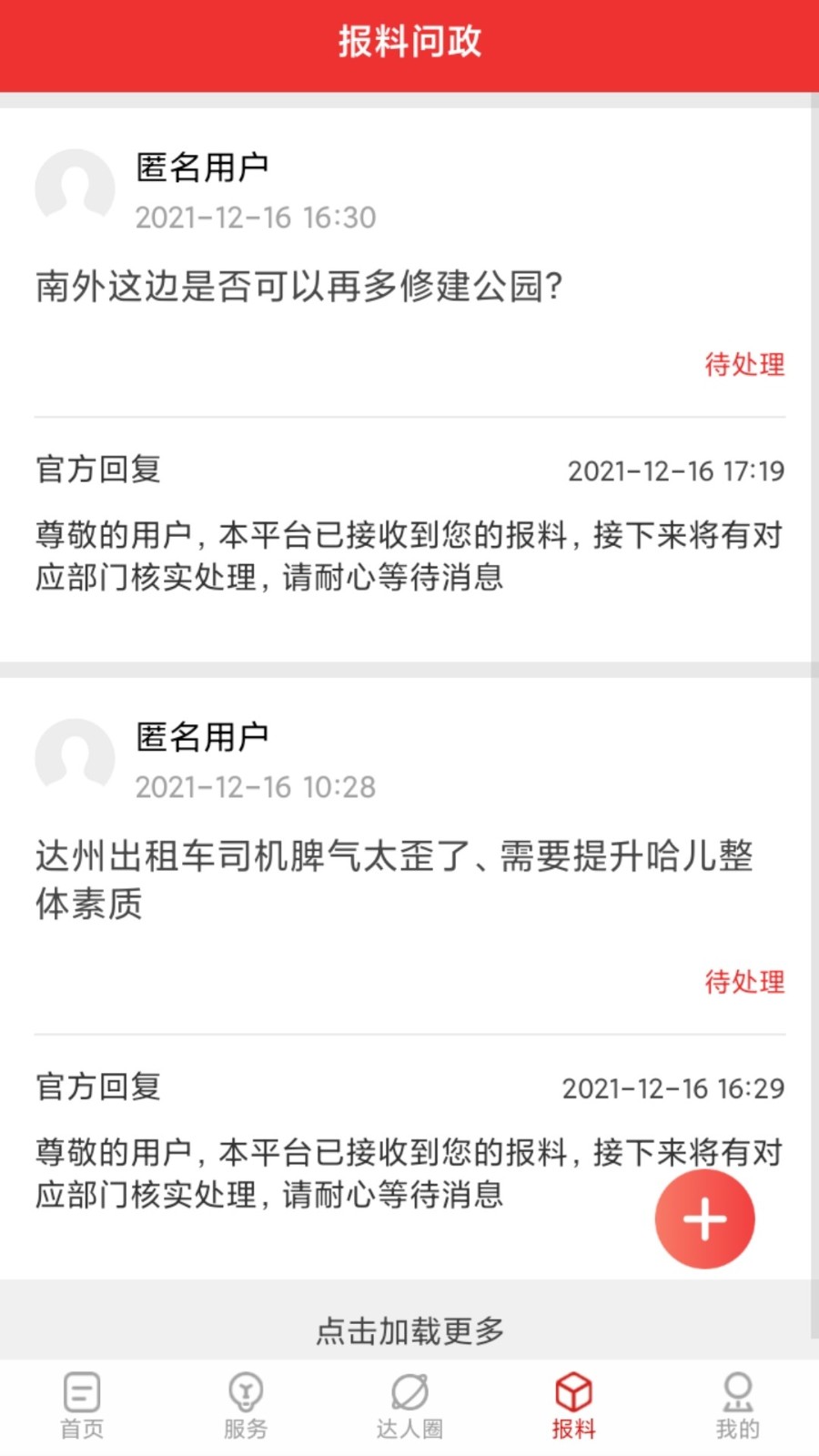 2.登录后重新进入APP,点击右下方的“报料”进入报料问政界面