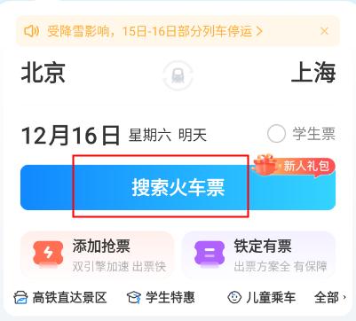 1、打开高铁管家,输入行程的起点跟终点站,选择购票的日期,点击搜索火车票按钮。