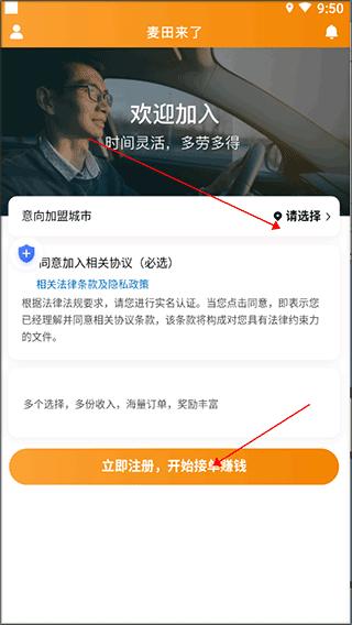 2、进入之后选择你需要的城市,并点击下方的立即注册,开始接单赚钱。