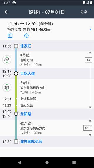 3、选择出发,到达,时间,即可获得多种换乘方案。包含:路线,时间,票价,距离。
