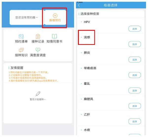 3、添加“新增预约”,选择“流感”,进行流感疫苗“预约接种”。