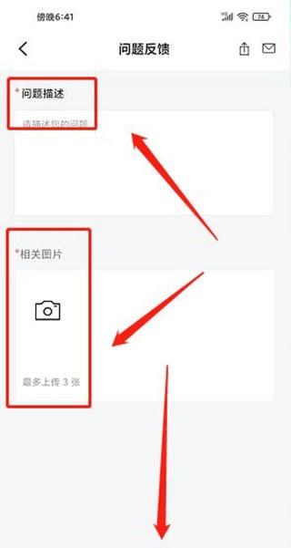 进入问题反馈界面,输入问题描述、上传相关图片,点击【提交】。