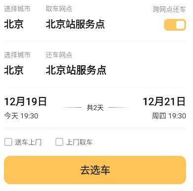 2、输入取/还车信息后点击【去选车】。