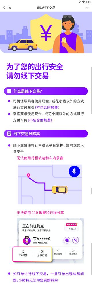 2、请勿使用现金、或除花小猪以外的方式支付车费(不包含附加费),为平台协调用户纠纷保留证据。