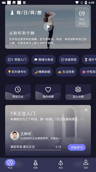 1、FLOW界面可以每日打卡,提供冥想入门、快速冥想、提升专注、关系处理、诗歌冥想等功能,页面下滑还有各种推荐活动,精选课程。