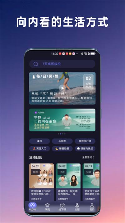 FLOW冥想app是一款能够缓解人们压力治愈心灵的健康软件,能够帮助用户可以放松身心,管理自己的情绪并且轻松入睡,借助互联网和科技的力量,打造了一个健康时尚,大家每天都能使用的身心健康生活方式平台。在这里可以轻松学习会各种冥想方法,从入门到进阶,在冥想中放空自己,提升专注力,获取平静和幸福感,同时拥有多种助眠小工具,即使是在失眠状态也可以放松入睡眠,舒缓身心释放压力,有需要的用户可以下载使用。