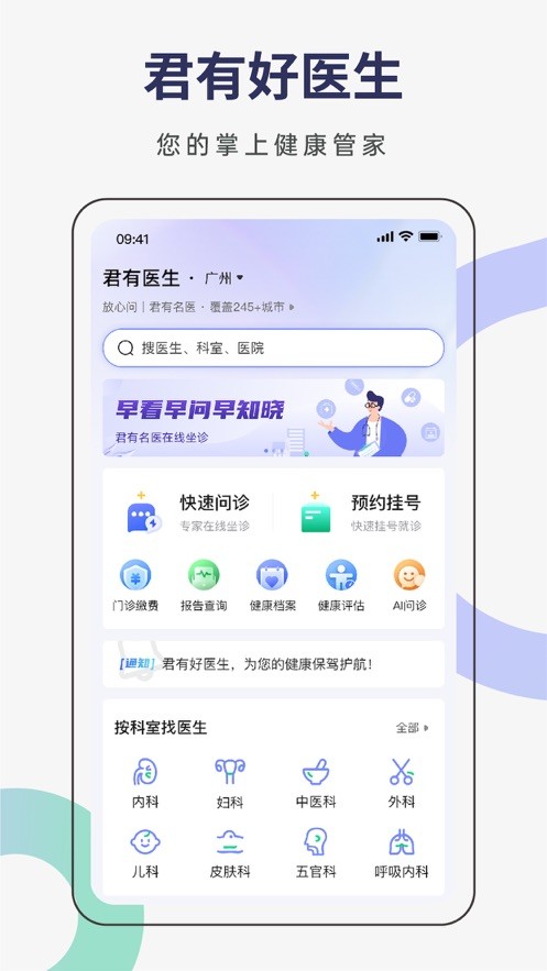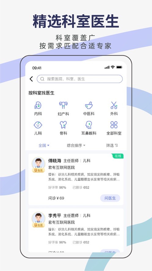 君有好医生是一款非常好用的手机线上就诊软件,为用户们提供线上预约问诊的服务,这里入驻了非常多的医生,为用户们带来了最为专业的诊治,让用户们可以不用出门就可以直接线上看病,还可以在这里抓药,如果你有需要的话就一定要来这里下载试试哦,可千万不要错过啦!