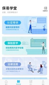 保易健康app,是一款保险学习软件,服务目标一般是从业保险业的委托人,非常是诊疗类商业保险工作中的人,当客户安装这个软件在手机的那时候能够在自身闲余的时刻学习培训保险知识,这儿专业设计了大学堂,客户进到大学堂能够开展身心健康风险性师的课程培训、学习培训商业保险医药学的专业知识內容及其医疗纠纷的相关法律法规。