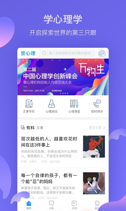 1、专业贴心:5000位心理咨询师进驻,为来访者提供专业的心理轻问诊,有需要的话还可以通过免费语音预约服务与咨询师一对一解答心事。