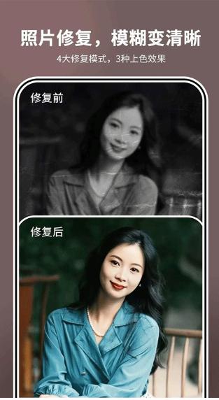 可使用app内的AI技术修复模糊的老照片,调整增强、清晰、补色等多种功能,让老照片焕然一新,保留美好的回忆。