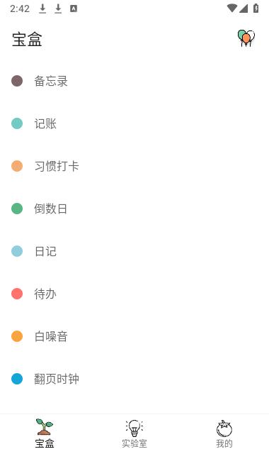 2.进入应用首页【宝盒】,可以看到各种工具,包括备忘录、记账、习惯打卡等。
