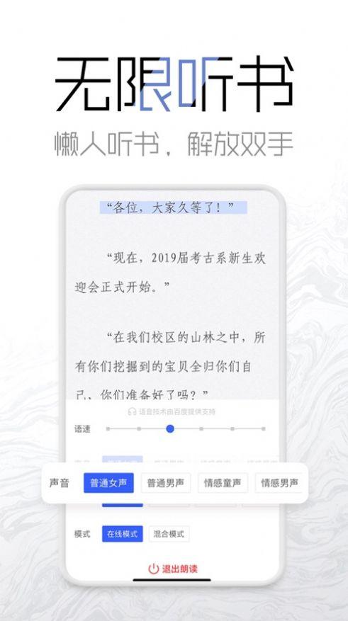 2、还有听书模式,可以解放你的双手双眼,躺着就能听到绘声绘色的的阅读模式,更加轻松看小说。