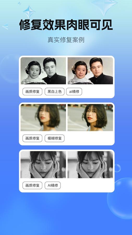 一键照片修复免费版这是一款智能化的相片修补工具,它是一款综合性的相片编辑处理软件,它具有各种不同的功能,可以在线上仅化地对旧照片进行修补,操作简便,能够很好地解决每个人对旧照片的修补需要,同时还可以为您提供更加高质量的服务,能够迅速地修补旧照片,非常方便快捷,全部都是免费的,不需要任何的会员。