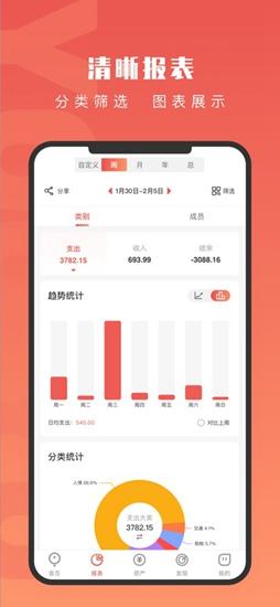 财务报表分析:提供丰富图表,如收支走势图、分类统计饼图等,方便看懂个人财务状况。