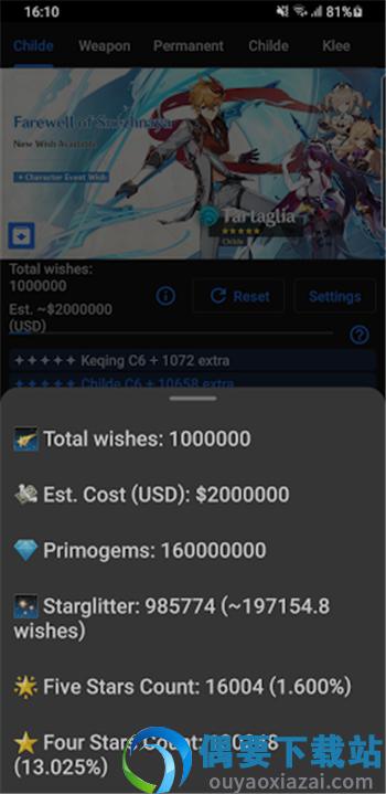 原神祈愿模拟器2.6中文版为用户们营造了游戏抽卡的模拟环境,有了这款应用,你就能够在手机中直接去进行抽奖,虽然抽到的奖励不会在你的游戏中出现,但是却可以对你身上是否有欧皇气息做出鉴定。
