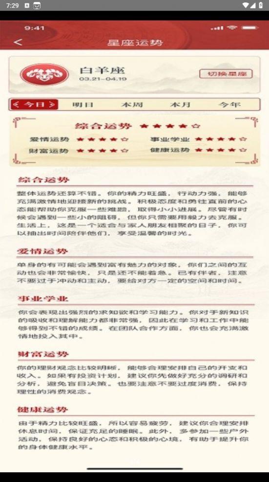 外出好运问一问app是一款融入了中国传统文化、风水命理、星座算命等多种元素的实用app。将传统文化与现代高新科技紧密结合,提供用户全面的黄历查询服务。用户能够轻松查看阴历、公历、节令、节日、留念日等各种信息,与此同时也可以根据自身需求定制个性化提示,如每日禁忌、生肖运程、十二星座运势等。