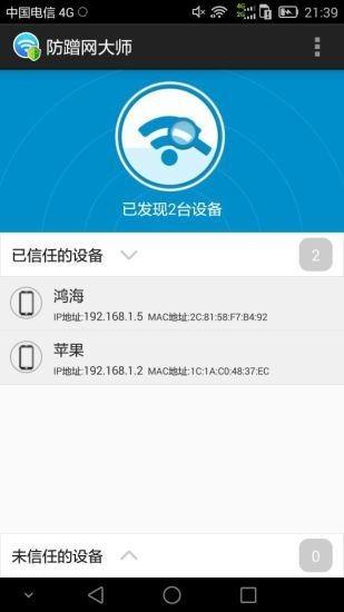 防蹭网大师这是一款可以快速管理移动路由器的软件。这个应用程序可以让您清楚地了解当前连接到WiFi 互联网的移动设备。 防蹭网大师只要发现不熟悉的移动设备,就可以直接将其添加到黑名单,这样别人就不会借用你的网络上网,玩游戏、看视频、下载文件都会更流畅。喜欢自己专属网速的用户千万不要错过。