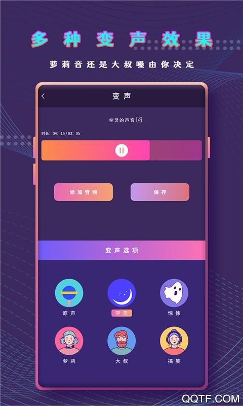 【录音变声搞笑合集】录音后,或者添加一段音频,然后选择一个你喜欢的变声效果,如:空灵、惊悚、萝莉、大叔、搞笑或者原声,每种变声效果超级有趣,保存后可以免费使用!