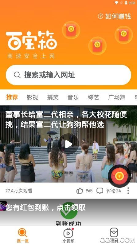 百宝箱浏览器app红包版是一款有趣的短视频赚钱软件。这个软件可以很方便的搜索资源,可以看到很多资料,还有短视频可以看。边看边赚钱,让您轻松无忧的赚钱软件,还等什么,快来下载吧!