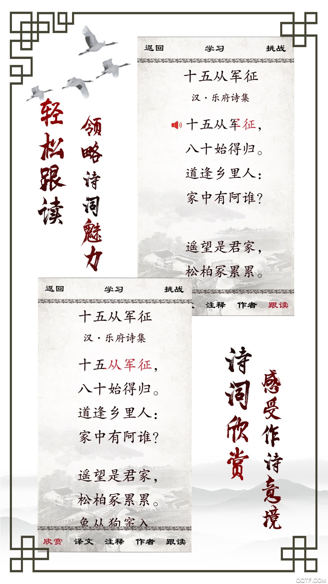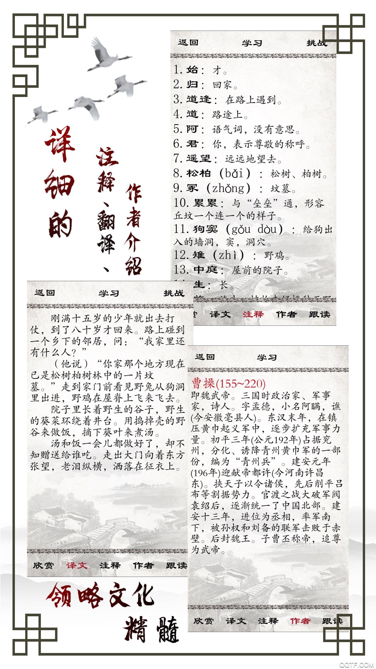古诗词的翻译、注释、作者、跟读,可以对古诗词进行详细的介绍和理解。