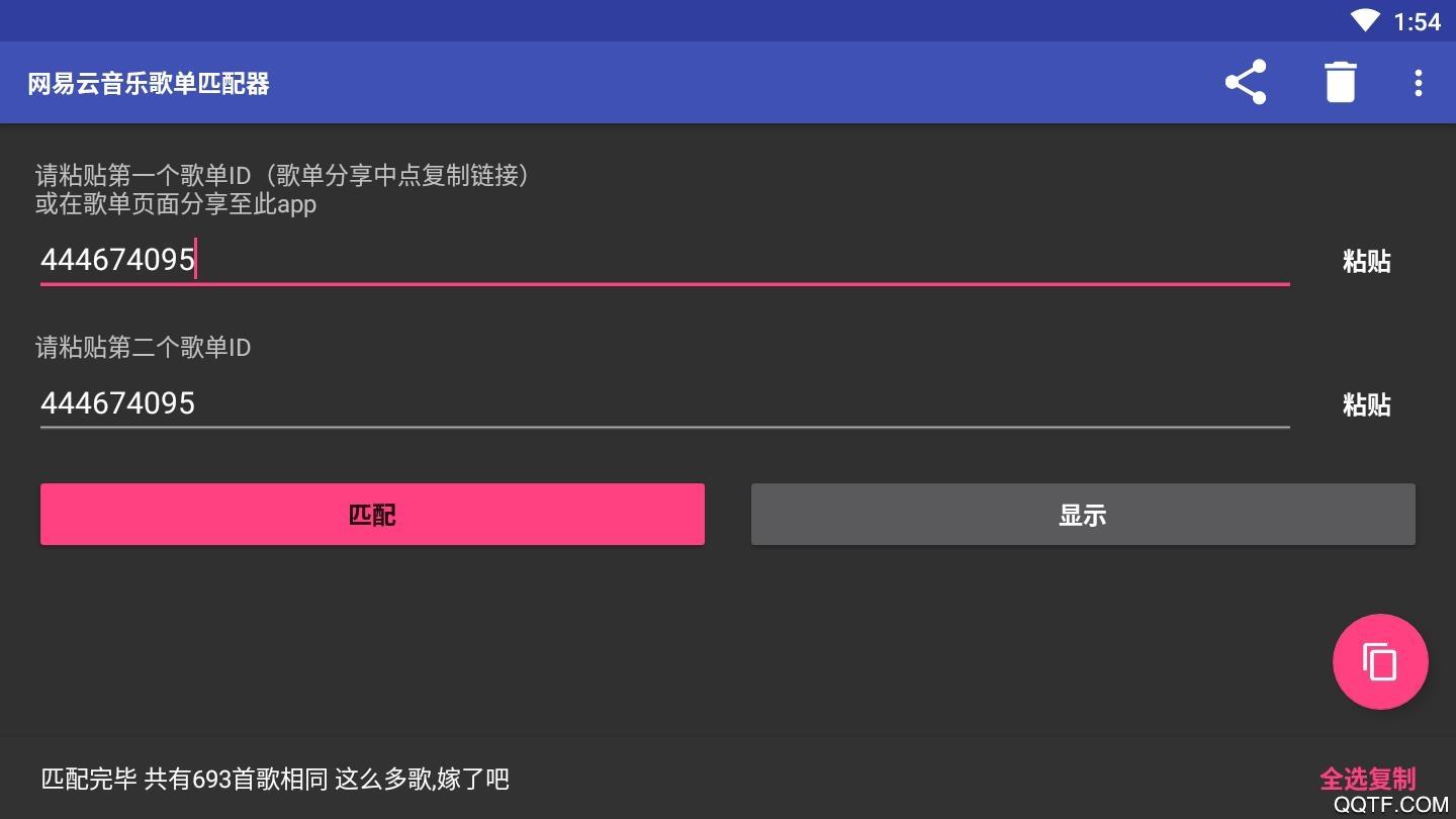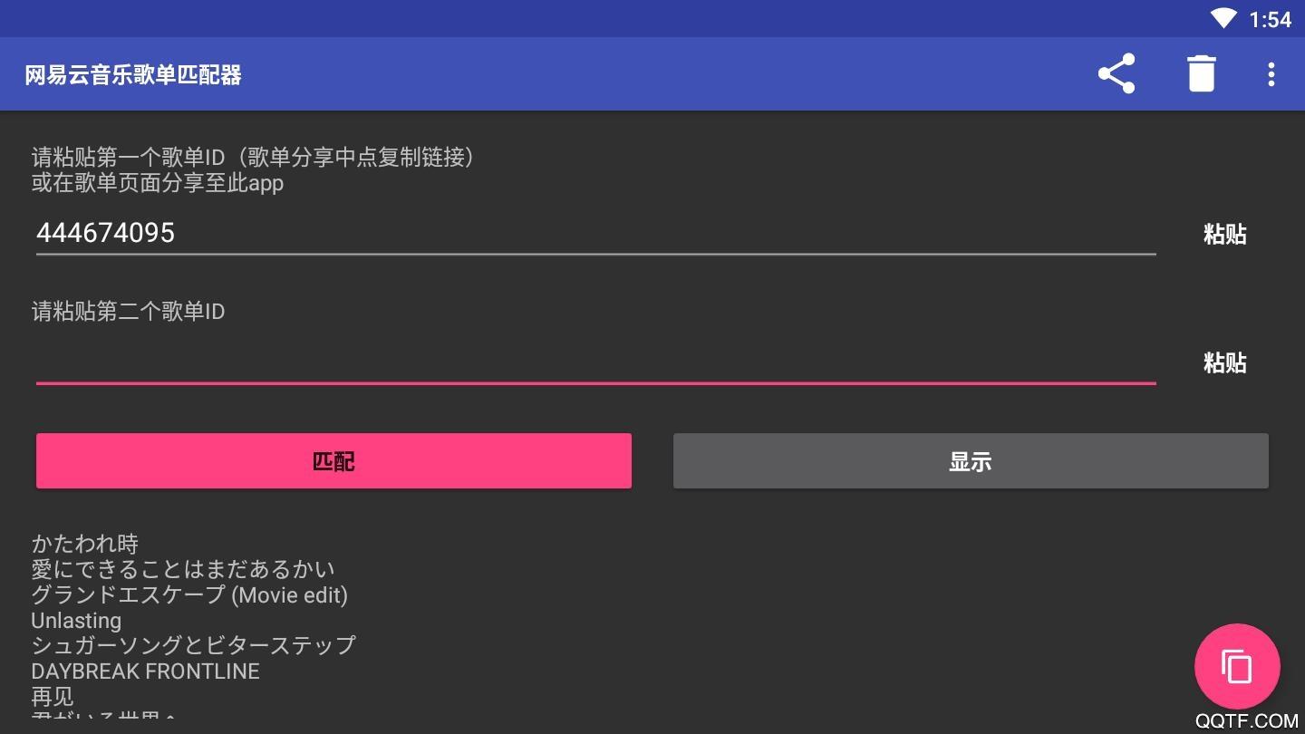 2、确认输入了播放列表ID后,选择下面的匹配按钮,开始匹配自己和对方的播放列表歌曲,看看哪些歌曲是相同的。