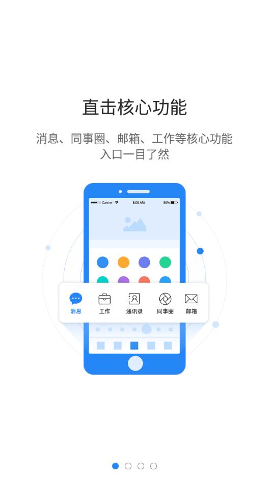 直击核心功能消息、同事圈、邮件、工作等核心功能清晰入口