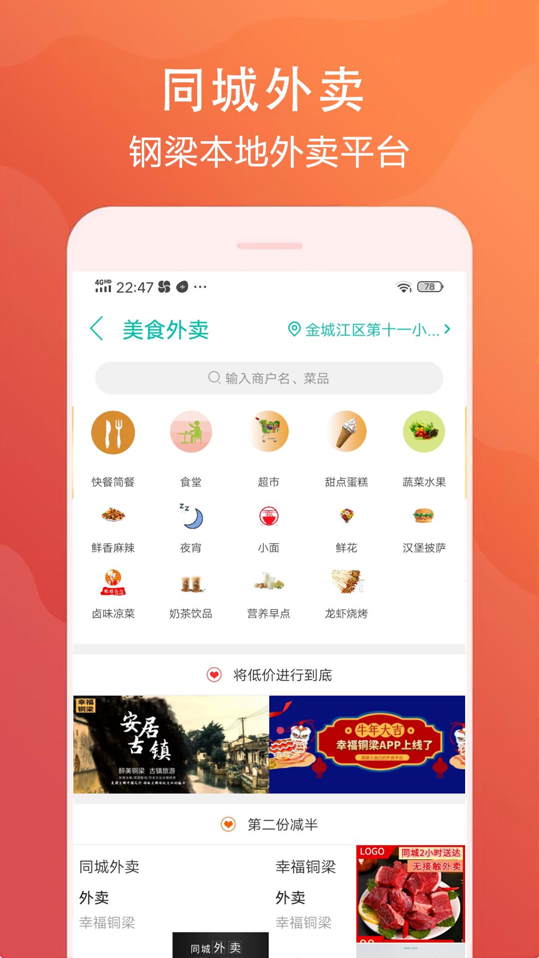 快乐铜梁是铜梁人的本地生活平台。集外卖、跑腿、信息发布、求职、代驾网约车、网上商城、吃喝玩乐为一体。对于铜梁人来说,一个APP就够了。