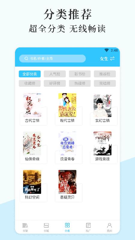 3.涵盖众多网络小说,包括现代、玄幻、言情、武侠、科幻、都市小说等多个类别,满足各类人群的阅读需求。