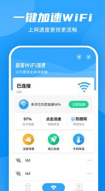 超强WiFi加速app最新版是一款wifi加速软件,可以一键连接附近的wifi,并且可以实时监控网速。它还可以提供提高网络速度的方法,让您可以无延迟地使用手机。软件体积小,不占空间。喜欢的朋友赶紧下载试试吧。