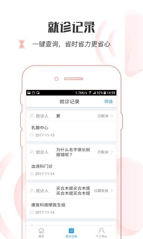 1、随便预约也没关系。点击“预约受理”页面,即可轻松享受7个工作日内外部号码的预约服务。选择患者、选择医生或条件即可完成预约。