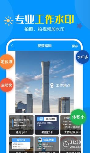 加水印打卡相机app安卓版是一款超级好用的给手机添加水印的拍照软件。它有助于在拍摄精彩生活照片时添加水印。可以为照片和视频添加专业水印。它会自动同步团队内容。使用起来非常方便。有需要的朋友,快来下载吧!