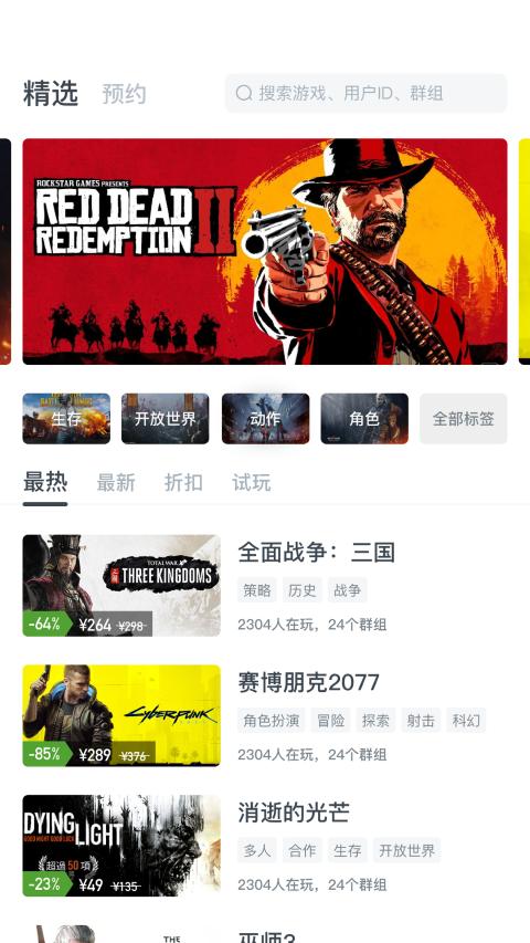 2.游戏库:即将推出、特价优惠、热门游戏、最新游戏、试用评测