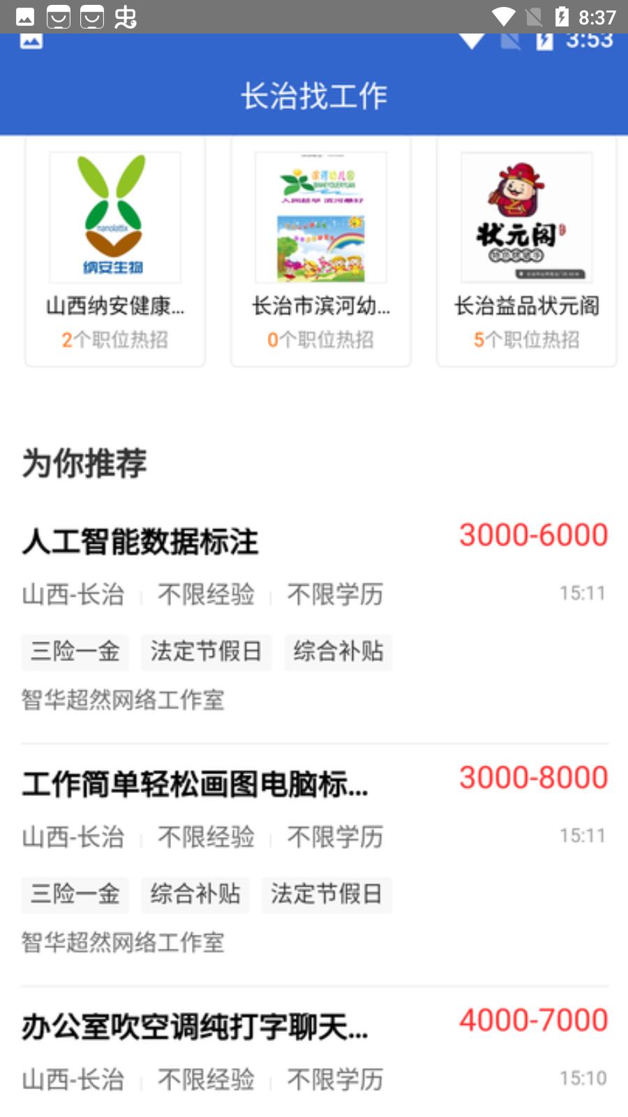 长治找工作最新招聘信息网安卓版是一款非常优质的移动求职招聘软件。软件中有大量的职位信息。用户可以在线筛选自己喜欢的职位,创建简历并一键提交。软件中的所有职位都是安全的,并且经过了严格的审核。保证,喜欢的话就来腾飞网下载吧。