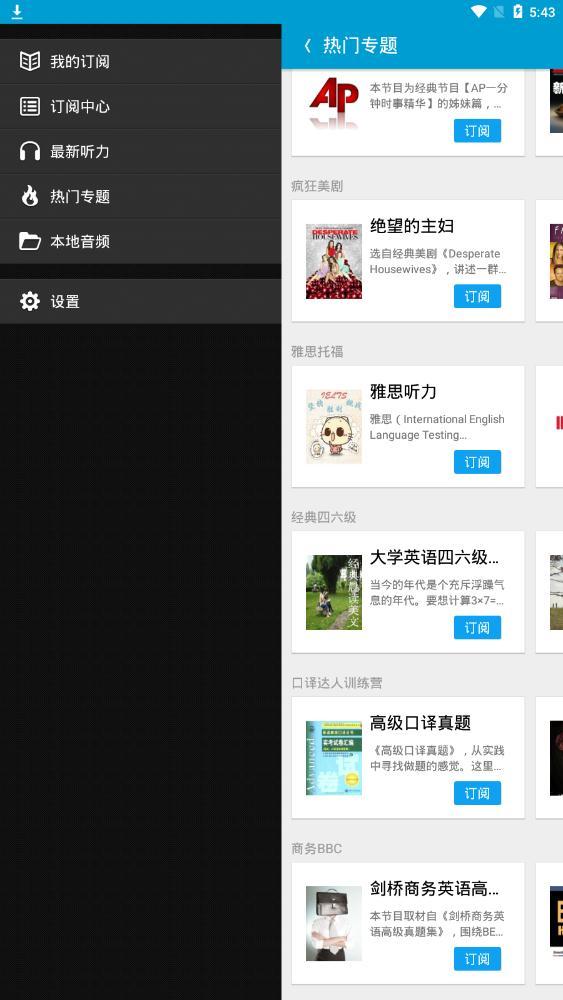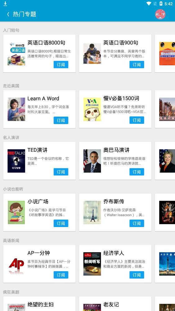 1.个性化订阅:经典教材和各种考试,名人演讲和动画台词,奥巴马和柯南,想听什么就听什么,练习听力也可以是一件有趣的事情。