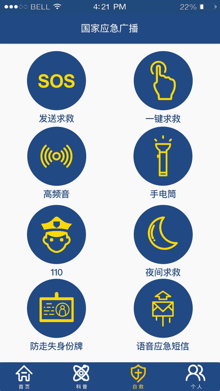 国家紧急广播APP提供了八种自救功能,大致分为三类:通过屏幕/闪光灯发送信号、通过手机内置外接扬声器发送信号、通过手机内置外置扬声器发送求救信号。预设拨号/紧急拨号。